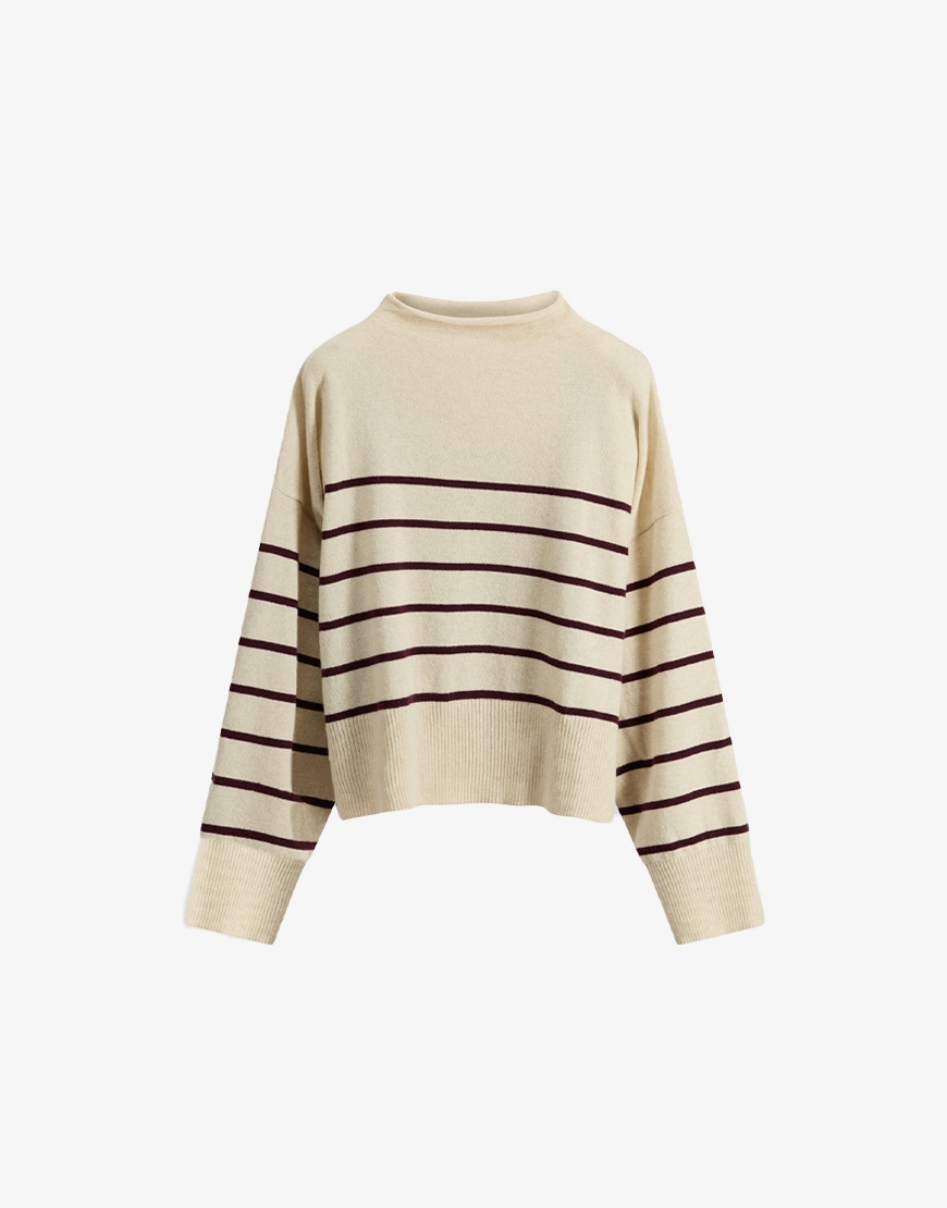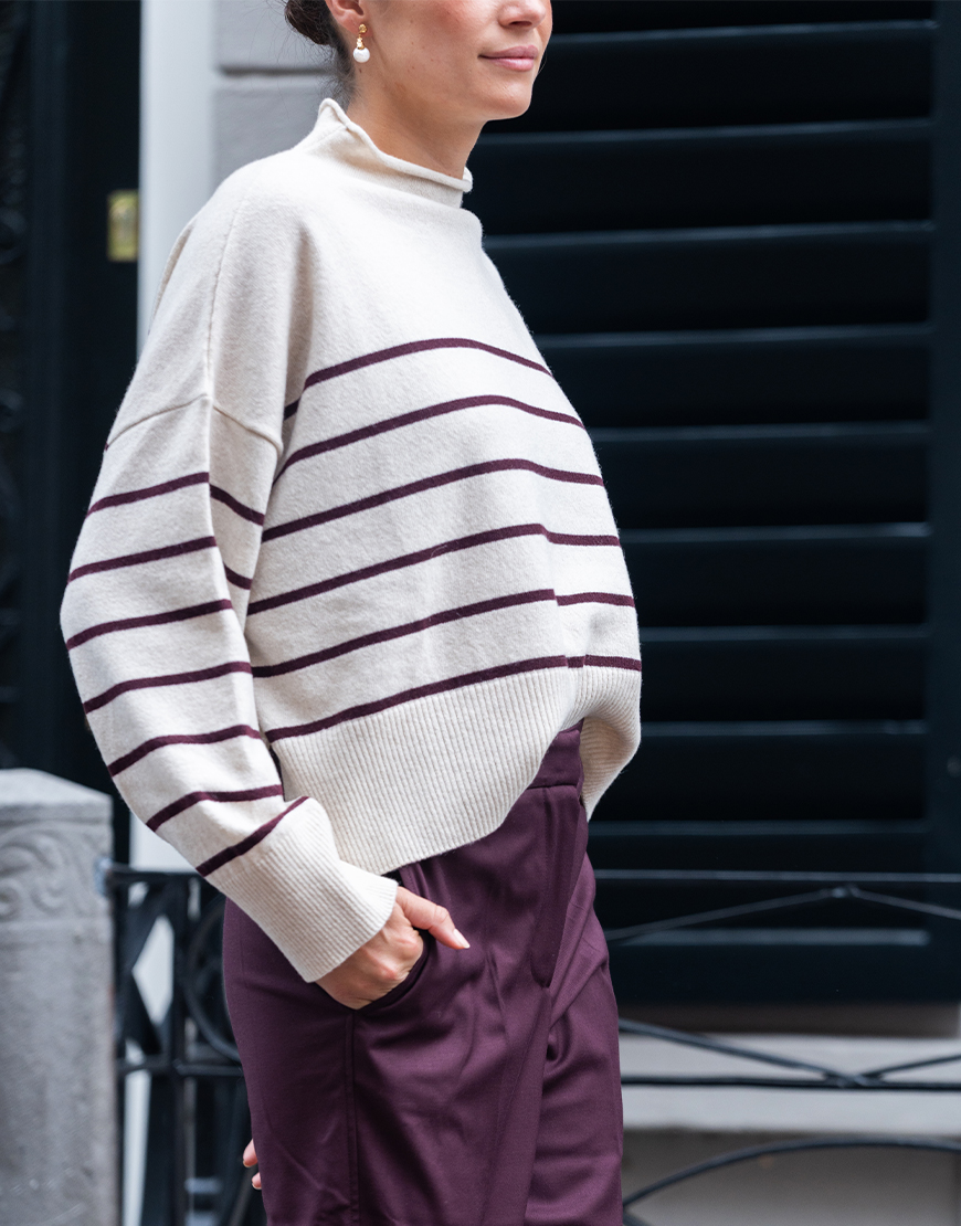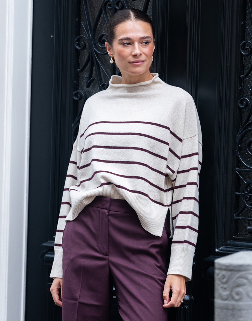 Deze 8PM Anne gestreepte trui in rib breisel ecru met toffe bordeaux strepen is een van onze favoriete van dit seizoen. Het heeft lange wijde mouwen, ruime lage mouwinzet, gemaakt van wol en cashmere en opstaande rol kraag. Combineer de trui op een toffe jeans en maak de look af met sneakers en een gilet. Of op de mooie faux leren broek. Dit merk bij Keep it secret store is gemaakt in Italië en staat bekend om hun mooie materialen, goede pasvormen en alledaagse style.