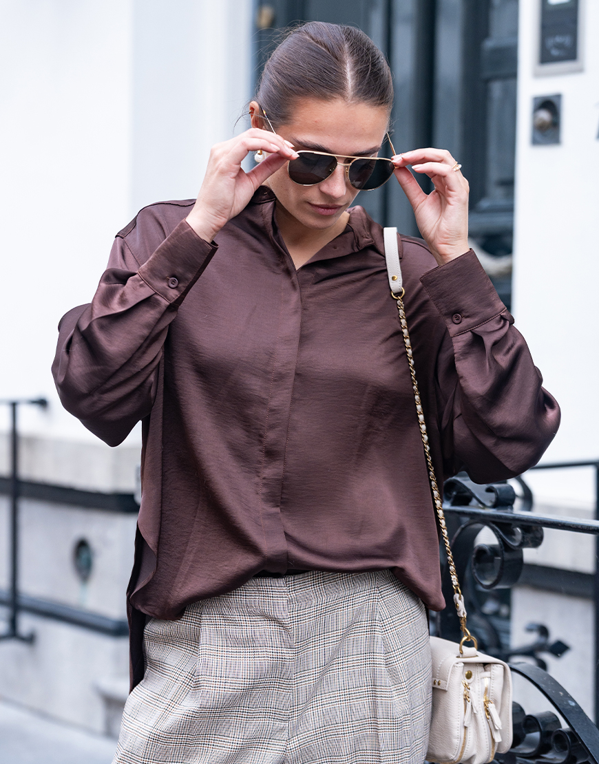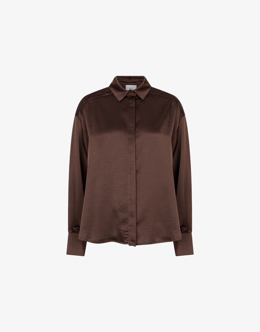 Deze 8PM Helen blouse in het donkerbruin is een prachtige semi transparante blouse met subtiele glans. De blouse heeft een klassieke kraag, knoopsluiting en een ruimere pasvorm. Dit nieuwe merk is gemaakt in Italië en staat bekend om hun mooie materialen, goede pasvormen en alledaagse style. Comfortabel en toegankelijk voor iedere gelegenheid, elegant en creatief. Combineer de blouse met een stoere jeans en gilet of wijde pantalon en maak de look af met sneakers of enkellaarzen.