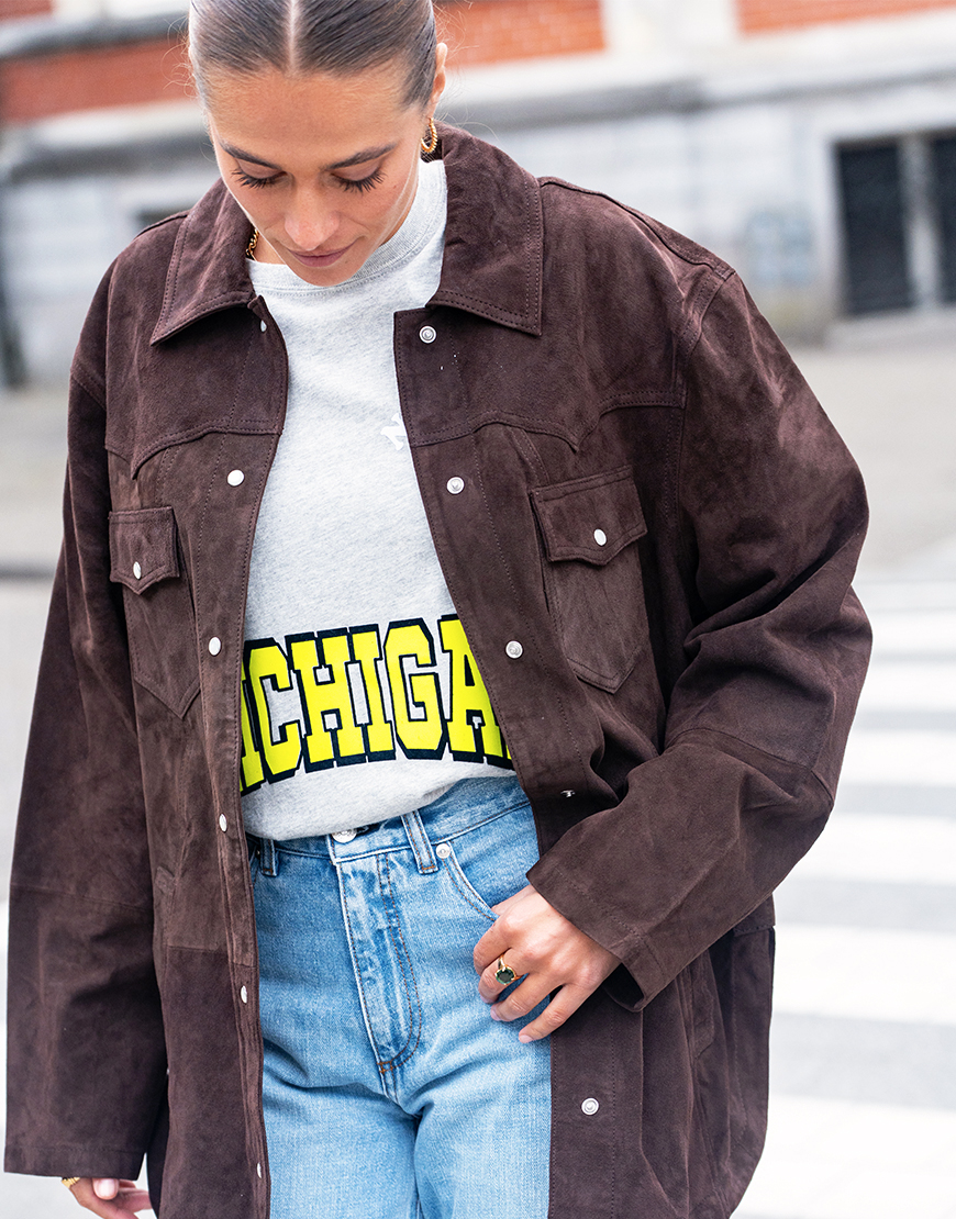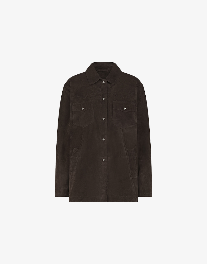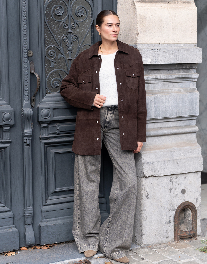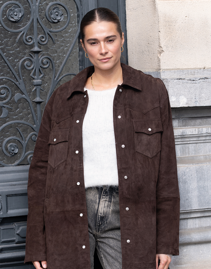 Dit toffe Alter Ego Georgia suède leren western jack in mooie donker bruine tint die je zowel als blouse als jack kunt dragen is perfect voor aankomend seizoen. De nieuwe favoriet en een musthave voor in je garderobe. Echt een jack waar je jarenlang plezier van hebt. Het jacket is gemaakt van leer wat heerlijk draagt als blouse in de winter en zomer of als zomerjas. Het heeft een klassieke kraag, lange mouwen, drukknoopsluiting en toffe details. Combineer dit jack over al je outfits en style af met een mooie tas.