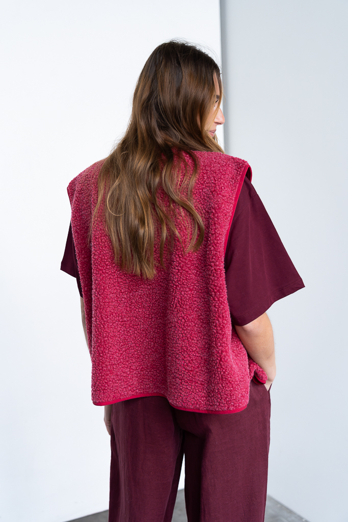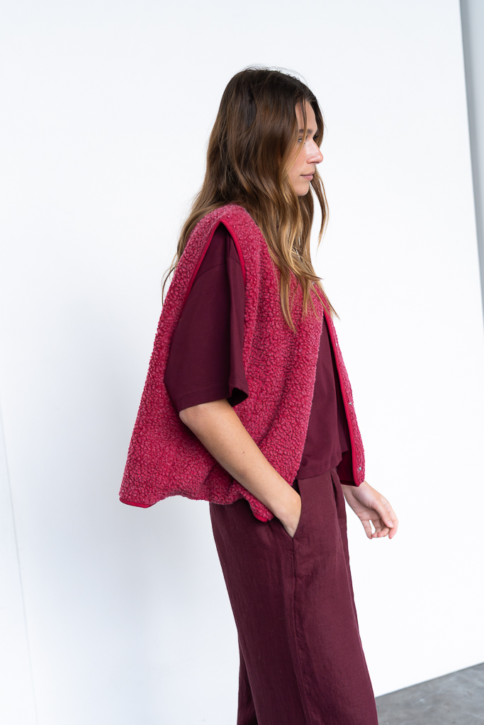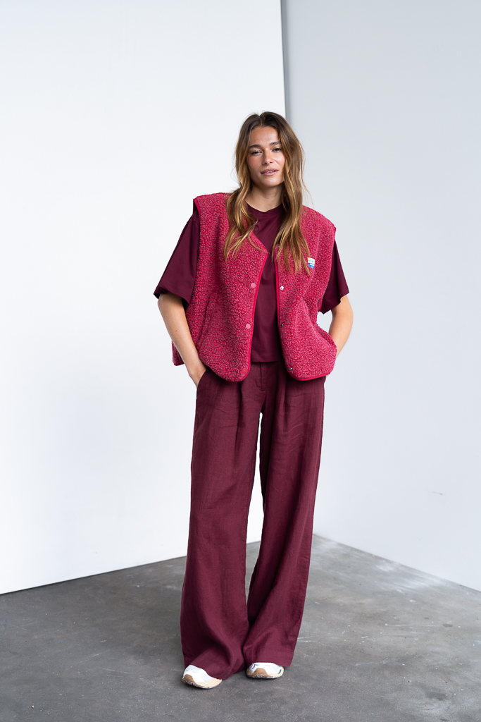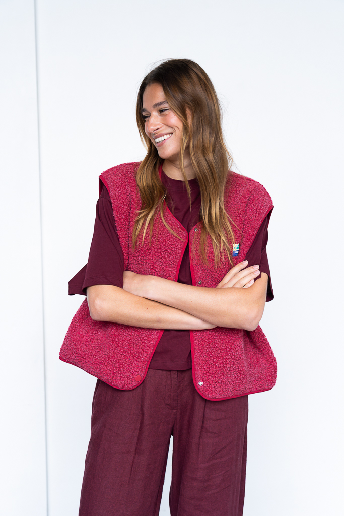 Dit American Vintage Hoktown gilet in magenta is een absolute musthave voor dit seizoen en een echte eyecatcher. Het gilet is is gemaakt van een zachte teddy stof, steekzakken met ritssluiting, drukknopen als sluiting en tof logo aan de voorzijde. Door de toffe kleur maakt dit iedere outfit af. Draag het gilet over een basic top of mooie blouse en een fijne jeans, short of leren broek.