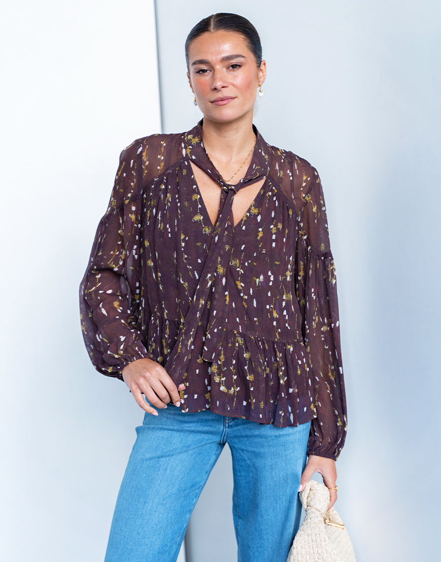 Deze Ba&sh Kamala blouse top in het bruin met prachtige geel ecru print maakt iedere outfit af. De trend kleur ook weer voor aankomend seizoen. De blouse heeft een mooie print, ronde sjaal hals met V-inkeping, lange mouwen met elastieken manchet, volant zoom, semi-transparant met voering en een los vallende pasvorm met mooie plooidetails. Style de blouse casual met een jeans of op een leren broek voor een avondje uit en hakken. Maak de look compleet door er een toffe tas en sierraden bij te dragen.