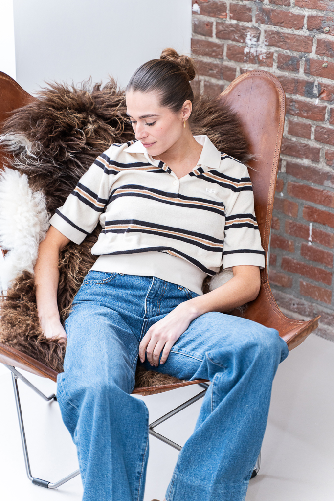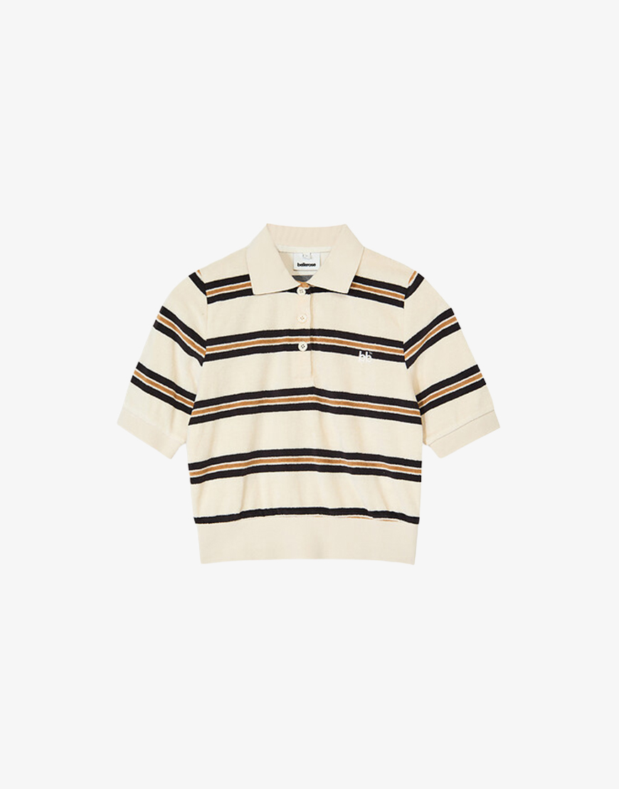 Deze Bellerose Crixus polo streep ecru is een van onze favoriete items uit de collectie van Bellerose. Een fijne secret basic waar je jarenlang plezier van hebt. Deze toffe zachte badstof polo is helemaal van nu en draagt heerlijk. De ecru streep combineert mooi met beige tinten, donkerblauw, rood, jeans en grijs en zwart. De top is gemaakt een katoenmix en heeft een elastisch boord. De top valt wat kleiner en meer aangesloten.