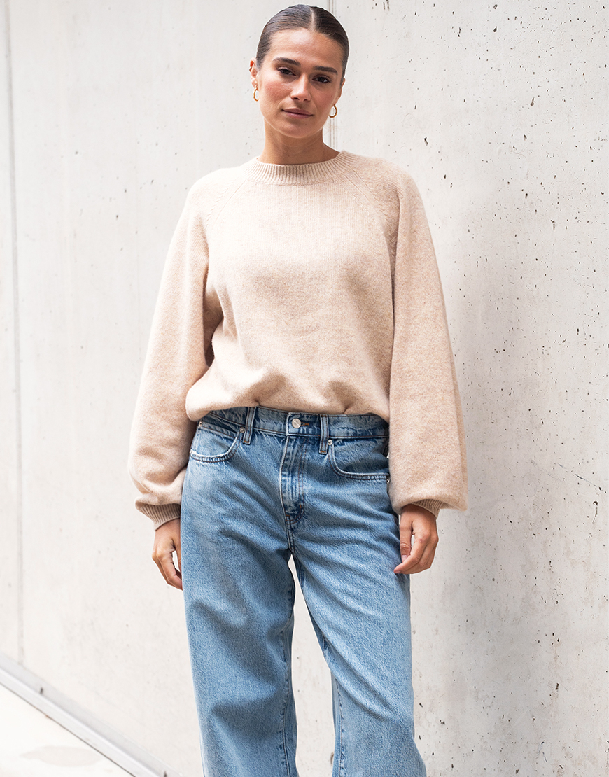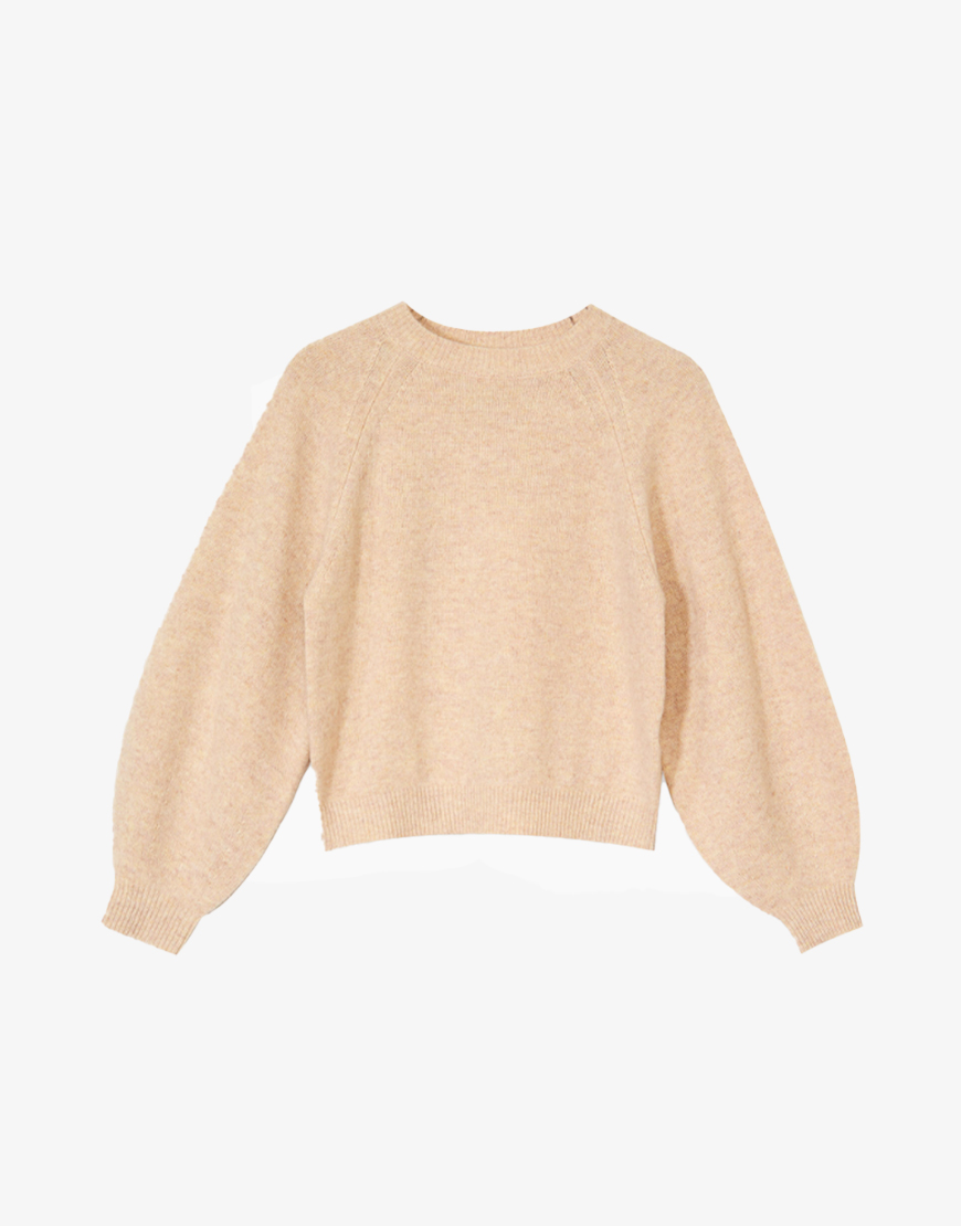 Deze Amika bellerose beige knit is precies goed, niet te grof, niet te fijn, en met van die mooie, volle mouwen die net dat beetje extra geven. De ronde hals en regular fit maken ’m supermakkelijk te combineren, terwijl de raglanmouwen en subtiele kabelstiksels zorgen voor een stijlvolle twist. De ballonmouwen eindigen in een geribde manchet met fijne details, comfy én chic. Style het
