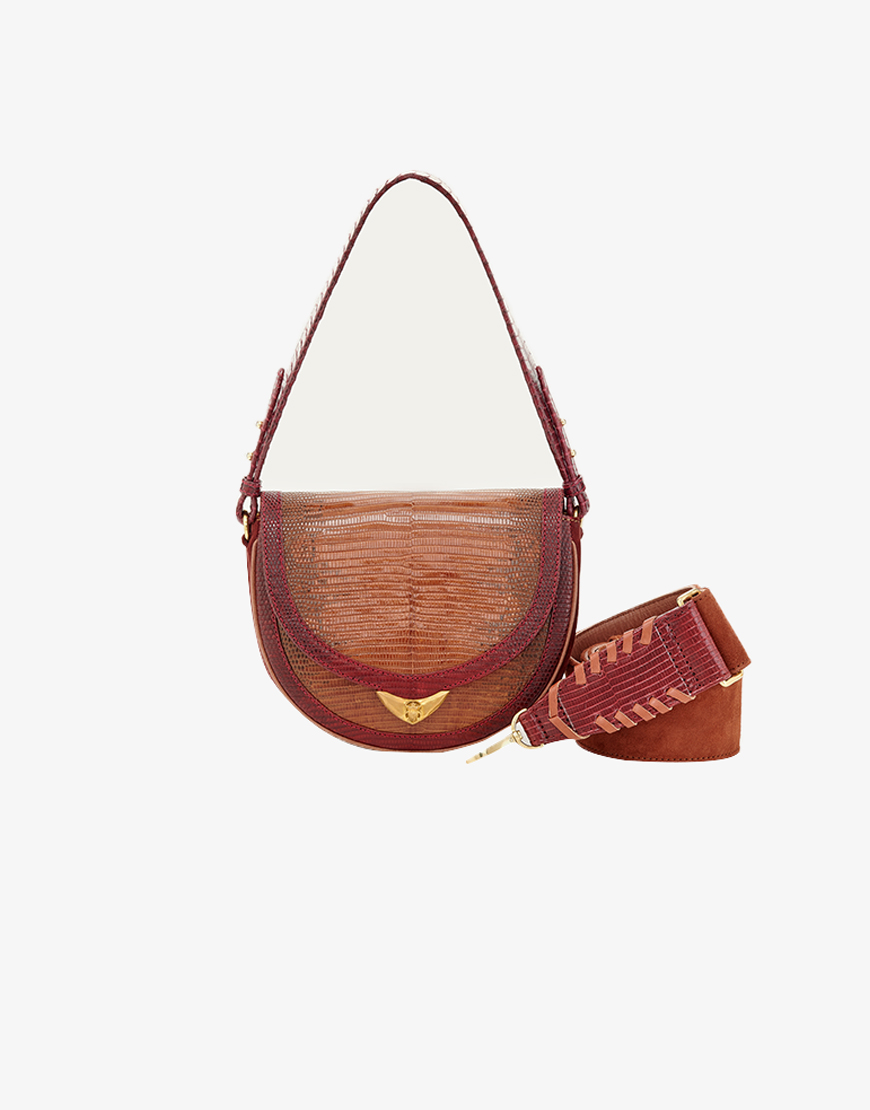 De Claris Virot Victoria tas in het bruin met bordeaux rode accenten is onze nieuwe favoriet van dit seizoen en mag niet in je tassen collectie missen. De tas is gemaakt van 100% hagedissenleer in combinatie met suĆØde. Heeft een klep met magneetsluiting en een gouden detail aan de voorzijde met een kleine kever en een groot vak met rit vak. Er zitten twee brede afneembare hengsels bij, een kort en een lang hengsel, je kan ze er beide tegelijk aan doen of er voor kiezen om er een aan te hangen. De tas combineer je met echt al je favoriete looks, zowel chique als casual. De tassen van Claris Virot hebben we in verschillende varianten en kleuren, hierdoor zit er zeker een bij die perfect bij je past