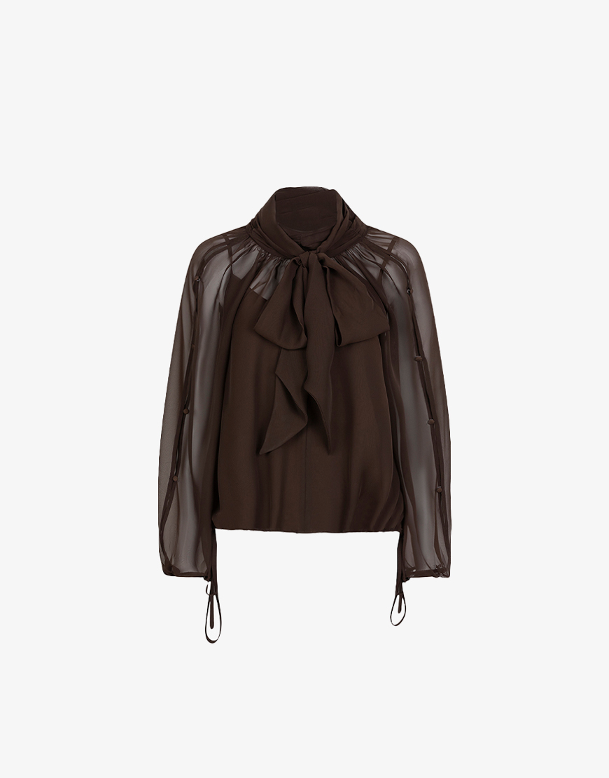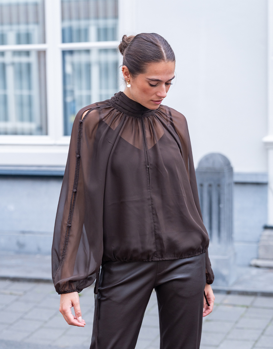 De Sonia blouse in Espresso bruin is een luchtige, boho-geïnspireerde stijl met een vrouwelijke uitstraling. Gemaakt van fijne chiffon (100% polyester) en geleverd met een bijpassende top voor extra comfort en bedekking. De blouse heeft een losse pasvorm, een hoge hals met strikdetail en elegante mouwen met splitjes en met stof beklede knopen. De rijke details maken het een veelzijdig item dat je makkelijk combineert met ton-sur-ton broeken voor een stijlvolle look.