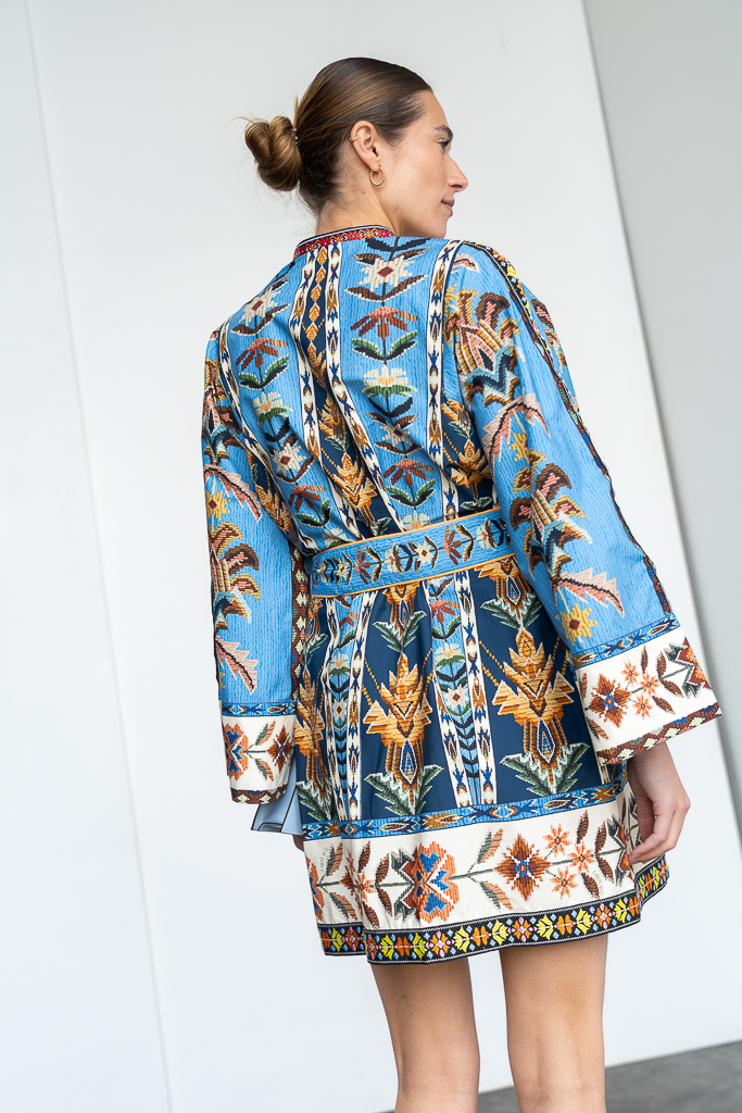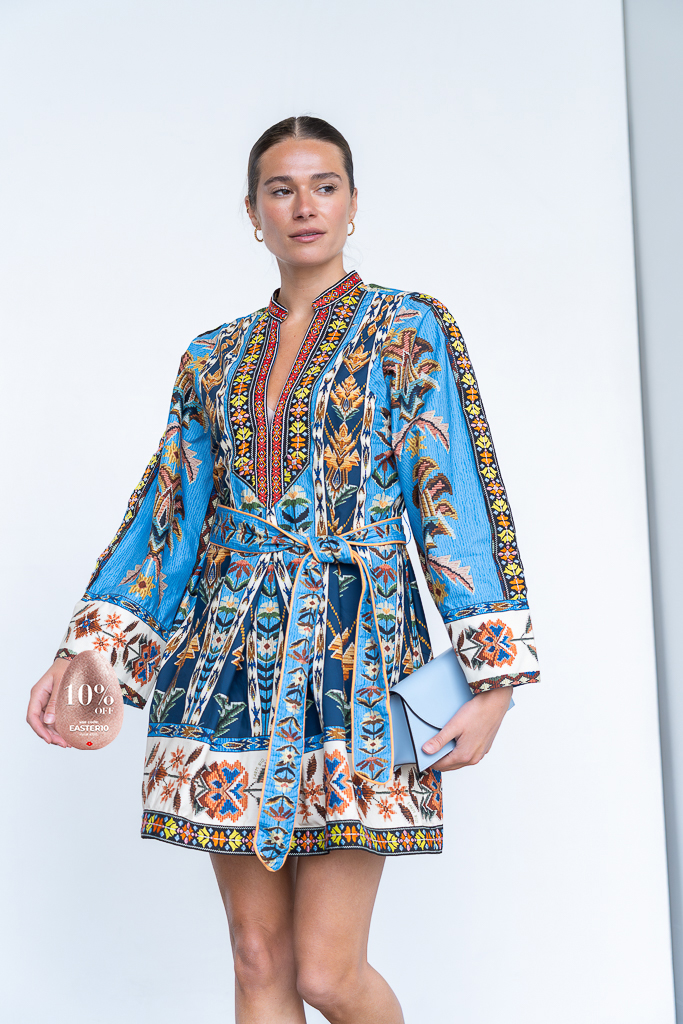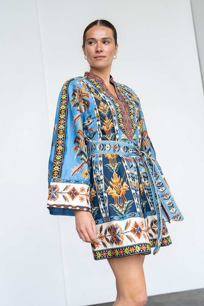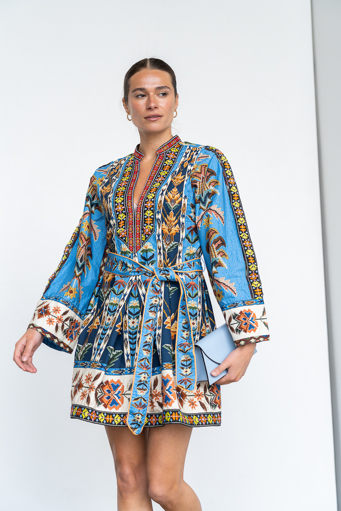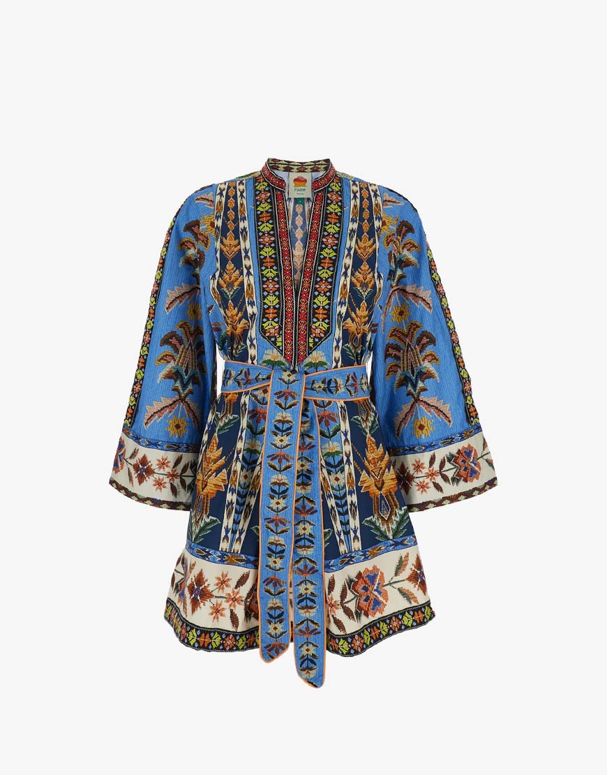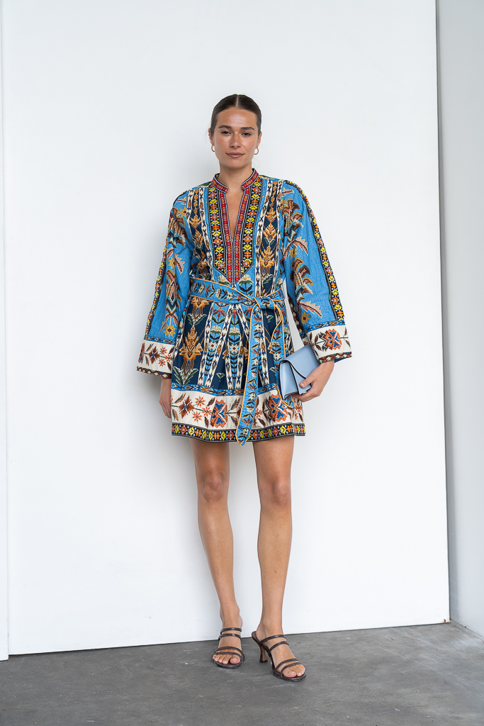 Deze Farm Rio embroidered tapestry blue mini dress is een perfecte jurk voor ieder feestje, bruiloft en om heel de zomer te dragen en een echte style secret. Valt mooi door de luchtige stof en kun je tailleren middels een ceintuur. De jurk is uitgevoerd in een mooie blauwe print en met broderie afgewerkt. De jurk valt normaal van maat. Farm Rio is een merk wat zich kenmerkt door hun rijke prints en meest prachtige afwerking.