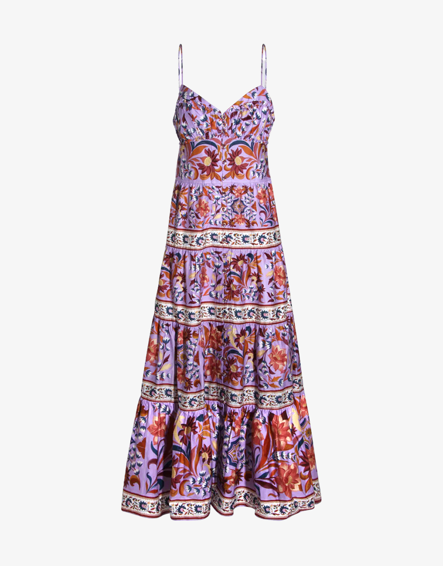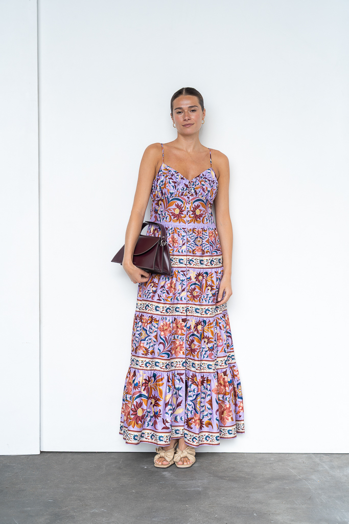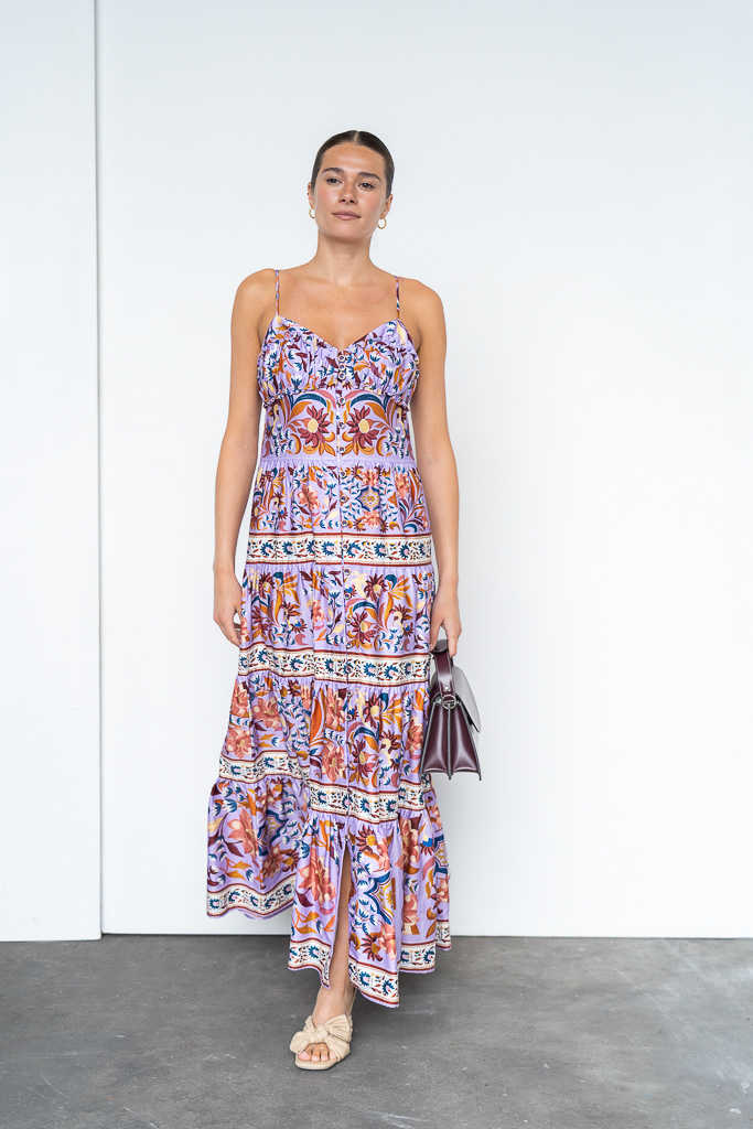 Deze Farm Rio Rio Flower Tiles maxi dress lilac is een perfecte jurk voor ieder feestje, bruiloft en om heel de zomer te dragen en een echte style secret. Valt mooi door de stof. De jurk is uitgevoerd in een mooie lila print, afgewerkt met rushes en knoopjes in dezelfde stof print. De jurk valt normaal van maat. Farm Rio is een merk wat zich kenmerkt door hun rijke prints en meest prachtige afwerking.