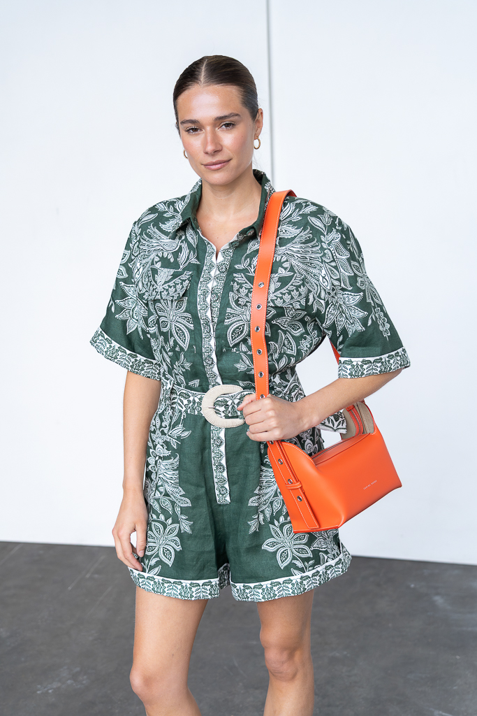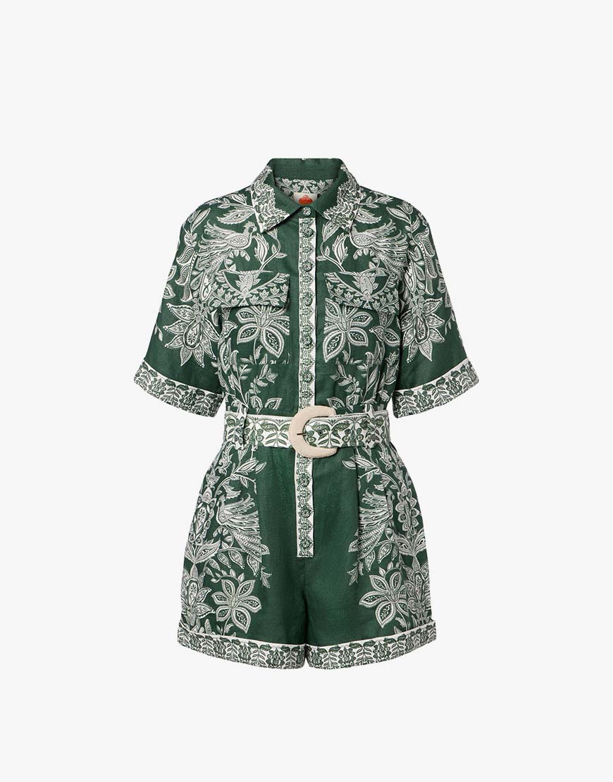Deze Farm Rio Miranda dark green jumpsuit is een van onze favoriete items uit de collectie van Farm Rio en een echte style secret. Deze jumpsuit heeft een hele mooie groenen print en is gemaakt van 100% linnen. De jumpsuit is afgewerkt met knoopjes in dezelfde print, een ceintuur en klepzakjes op de achterzijde Het jumpsuit valt normaal van maat. Farm Rio is een merk wat zich kenmerkt door hun rijke prints en meest prachtige afwerking.