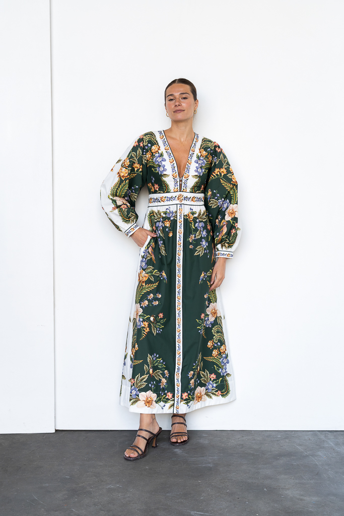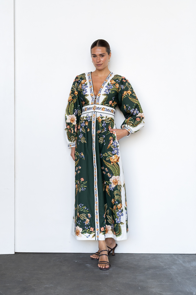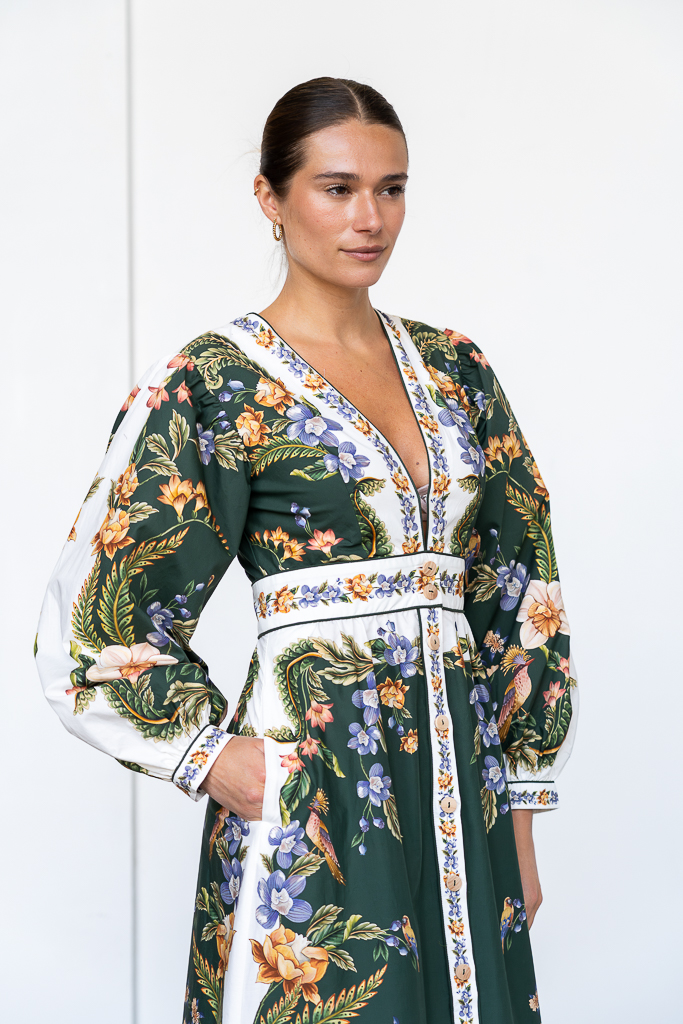 Deze Farm Nature green maxi dress is een perfecte jurk voor ieder feestje, bruiloft en om heel de zomer te dragen en een echte style secret. Valt mooi door de stof. De jurk is uitgevoerd in een mooi groene print, heeft een ceintuur en is afgewerkt met knopen in dezelfde stof. De jurk valt normaal van maat. Farm Rio is een merk wat zich kenmerkt door hun rijke prints en meest prachtige afwerking.