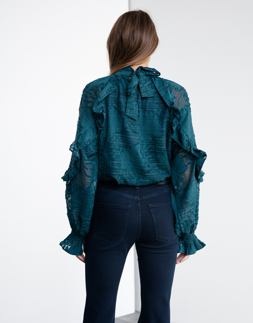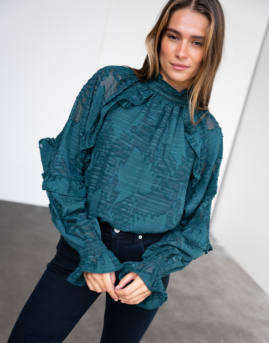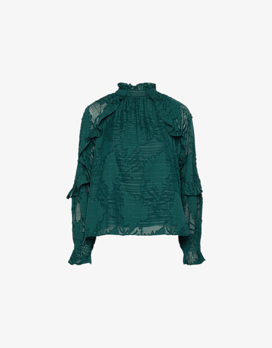 Deze Hofmann Copenhagen Inaya blouse in mooie groen tint met borduursel details en ruches is een echte style secret favoriet. Hofmann komt uit Kopenhagen en staat bekend om verfijnde duurzame investeringstukken. Deze elegante blouse heeft mooie ruches en borduursel details over heel de blouse, een hoge hals met striksluiting aan de achterzijde, lange wijde mouwen met ruches en elastieken manchetten, is gemaakt van 100% polyester en heeft doorschijnende mouwen en gevoerde body. Combineer de top een mooie jeans of pantalon en style af met een sneaker of hak voor de avond.