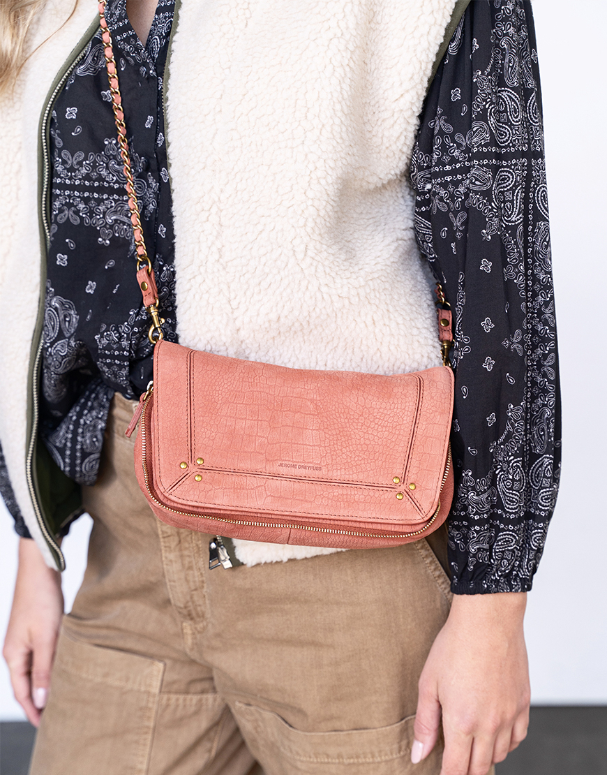 De Jérôme Dreyfuss Bobi S tas in suéde terracotta oranje tint en croco structuur is perfect voor meerdere gelegenheden. Gemaakt van hoogwaardig leer met een katoenen voering, ontworpen met unieke gouden details en een tijdloos design. De tas heeft een klein binnenzakje, is volledig gevoerd, heeft een spiegel en sleutel koord. Ook heeft de tas een rits aan de onderzijde om de tas nog wat groter te maken. Het hengsel is afneembaar en de klep is met magneten te sluiten. Een tas waar je jarenlang plezier van hebt en je overal mee kunt combineren.