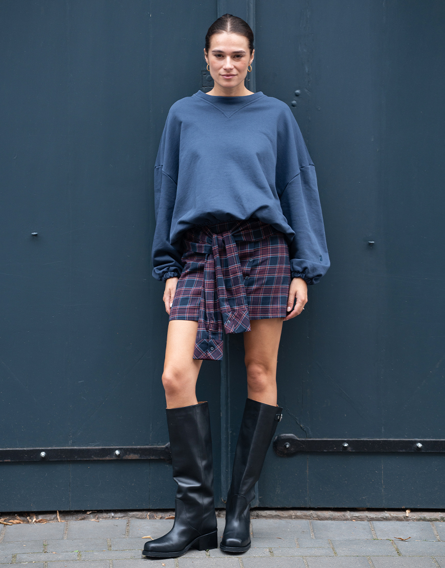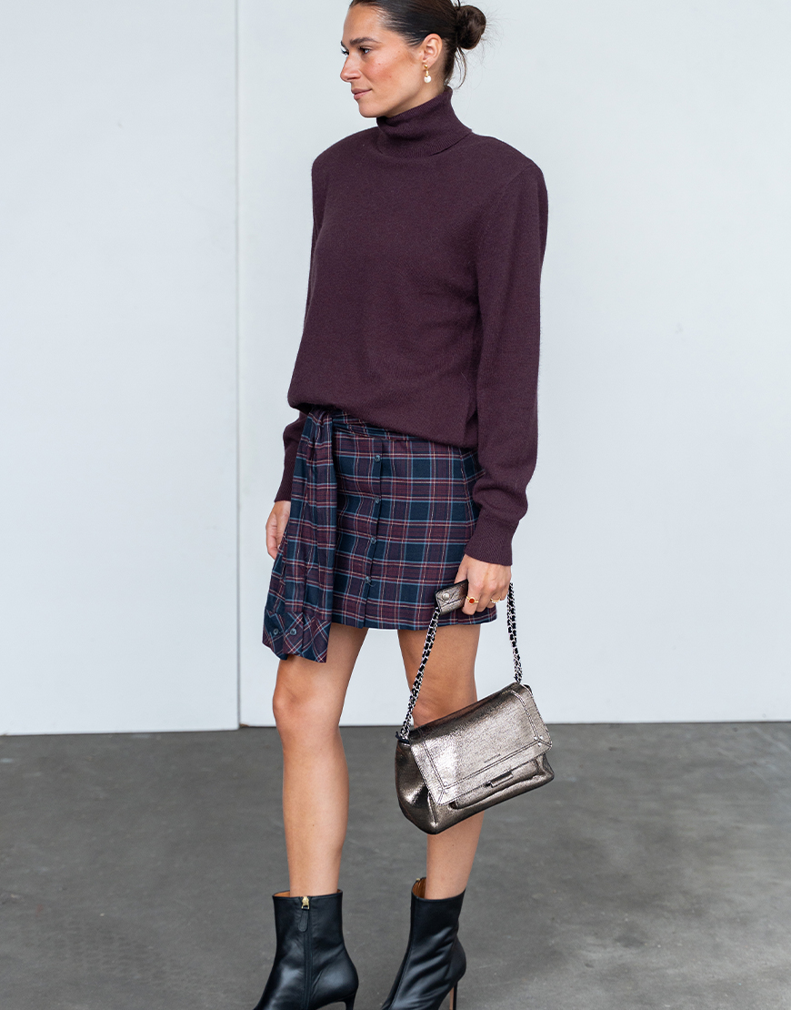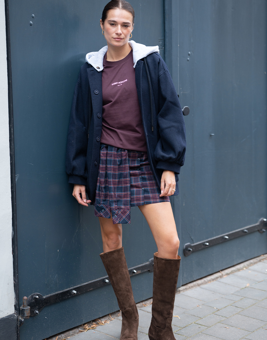 Deze March23 mini geruite Camilla rok in toffe schotse ruit navy bordeaux tinten is de nieuwe trend voor aankomend seizoen en mag niet ontbreken in je garderobe. De rok heeft een blinde ritssluiting aan de achterzijde, sierknopen aan de voorzijde, toffe twist met mouwen die je kunt knopen aan de voorzijde, voering en valt wat korter. Style de rok af met een toffe sweater of trui en een paar toffe laarzen. Of met een mooie blouse en hak of hoge laars voor een avondje uit.
