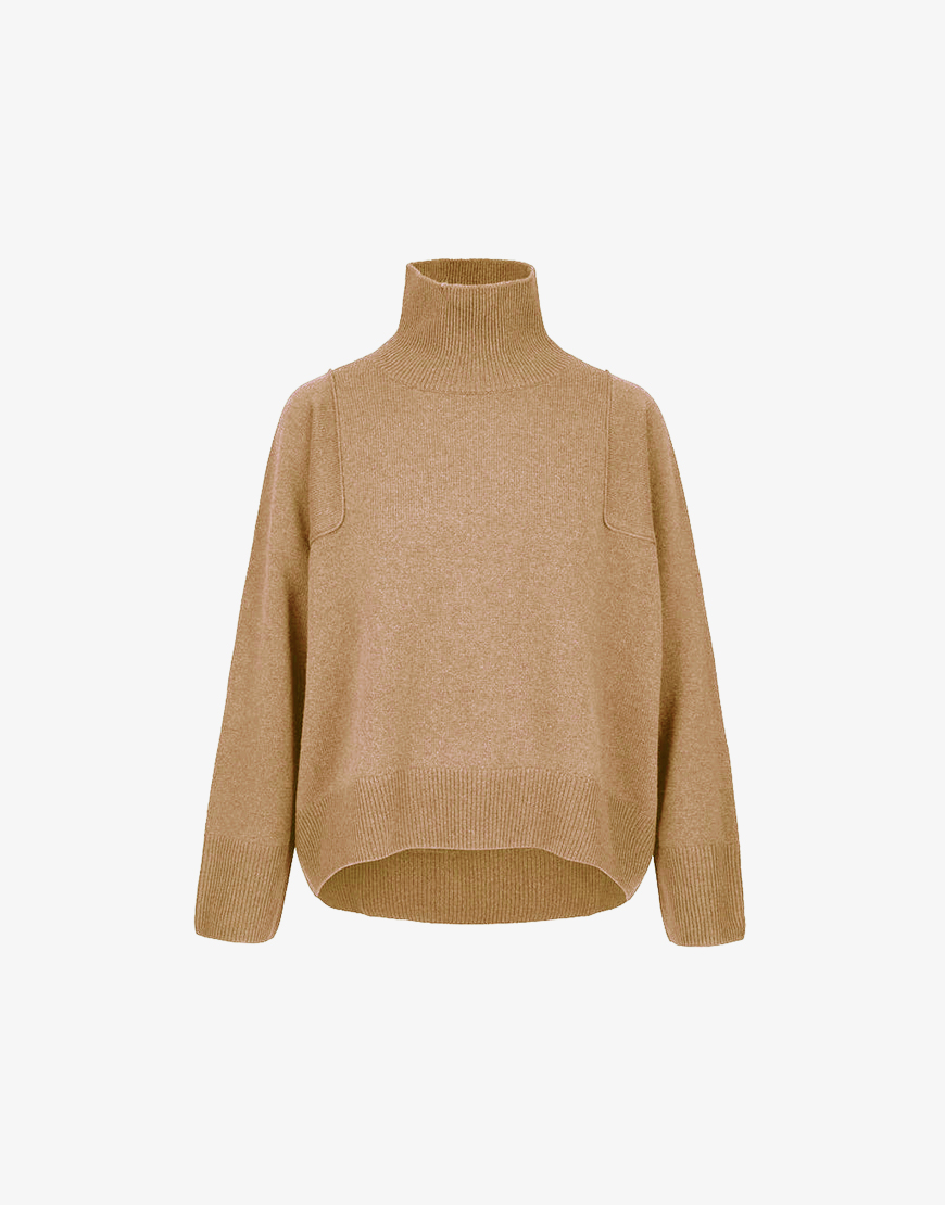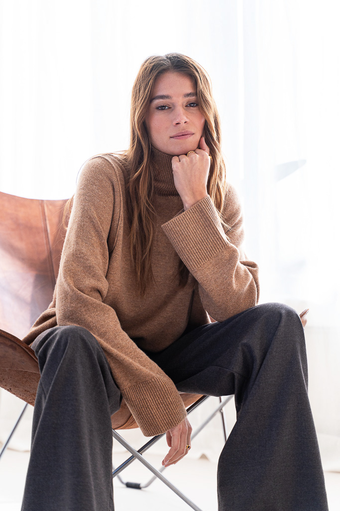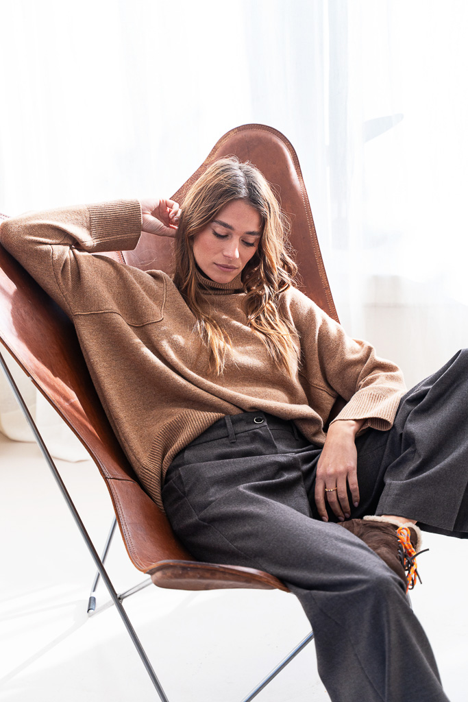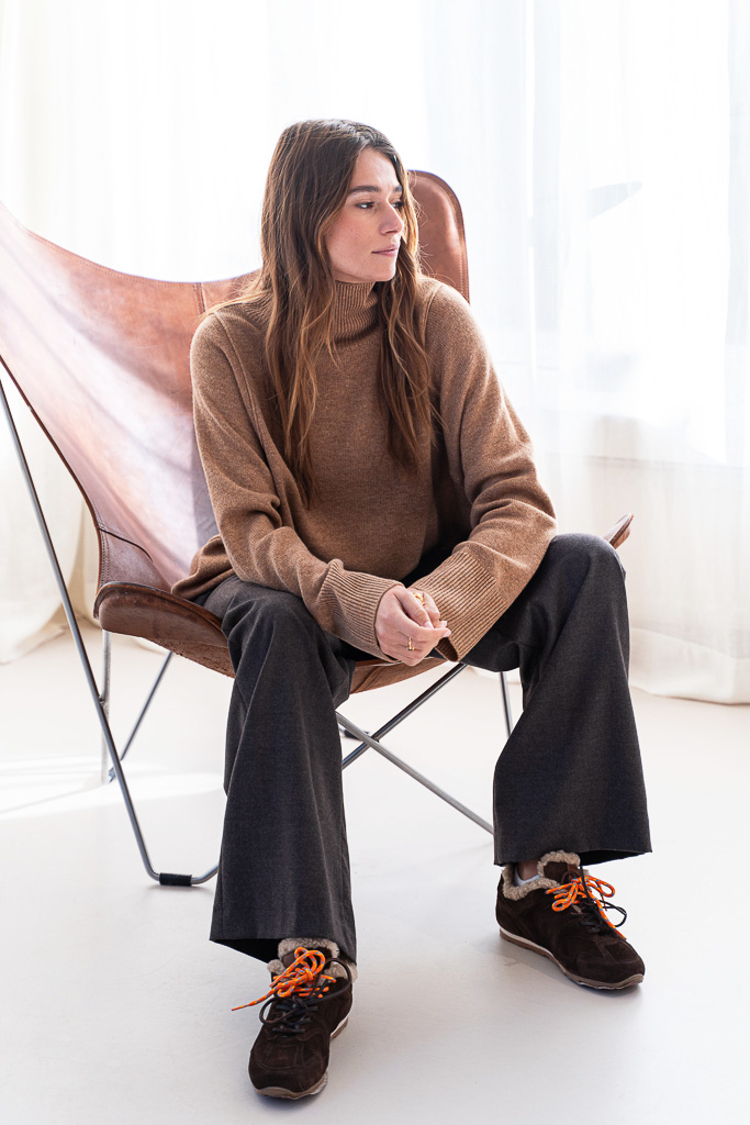 Deze Notshy coltrui wendy camel chine is de perfecte basic style secret. Deze mooie oversized coltrui is camel past perfect in het kleurpallet voor dit najaar en is echt zo’n item wat altijd goed is. De coltrui heeft een ruime pasvorm, opgestikte naden en een brede boord. Combineer het met andere bruintinten, beige, rood, grijs of jeans. De trui is gemaakt van een wol cachmere mix.