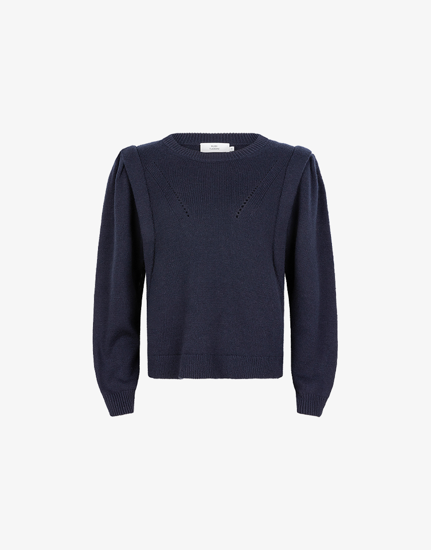 Deze Ruby Tuesday Violet trui in het donkerblauw is de perfecte basic style secret. Het heeft pofmouwen met toffe volume detail op de schouder, opengewerkte details aan de voorzijde, rechte pasvorm, ronde hals en is gemaakt van een fijne stof uit wol, katoen en recylced nylon. Combineer de trui met een mooie pantalon en maak de look af met sneakers en een gilet.