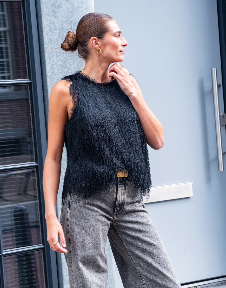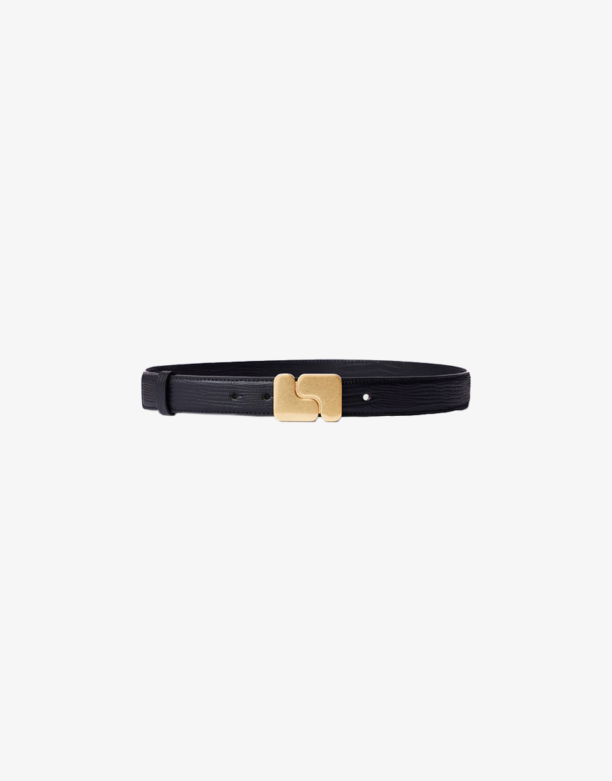 De Soeur Ninon riem in het zwart met een structuur in het leer en het Soeur logo als sluiting is een fijne riem voor elke gelegenheid. Gemaakt van koeienleer leer en afgewerkt met gouden hardware voor die luxe feel. Draag hem in een stoere jeans of juist met een nette pantalon.